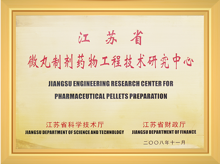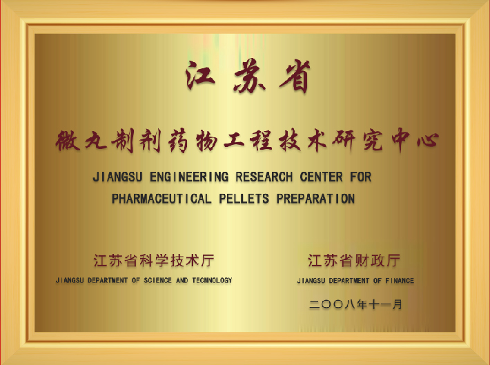 由江苏省科学技术厅、江苏省财政厅审核获“微丸制剂药物工程技术研究中心”